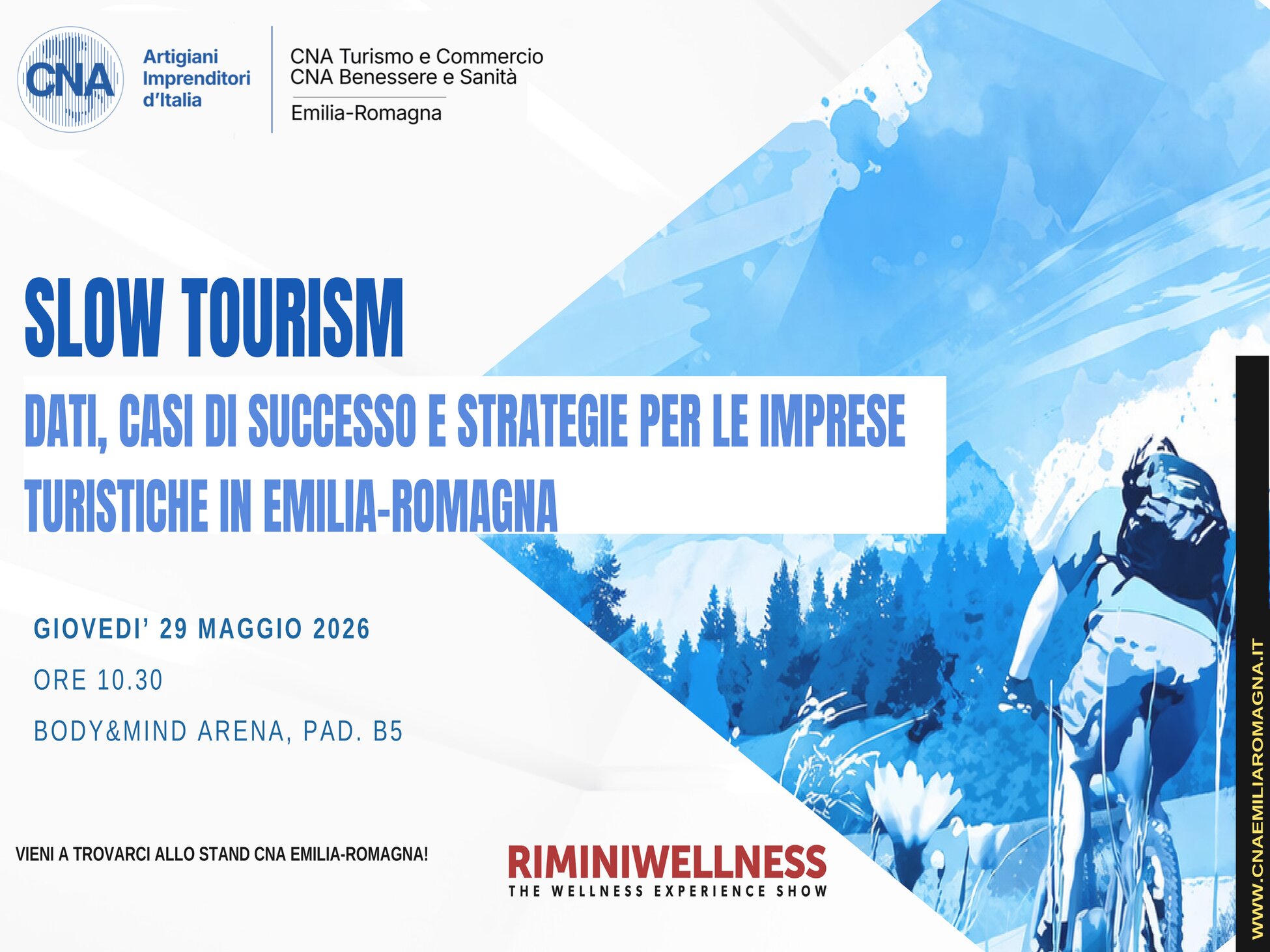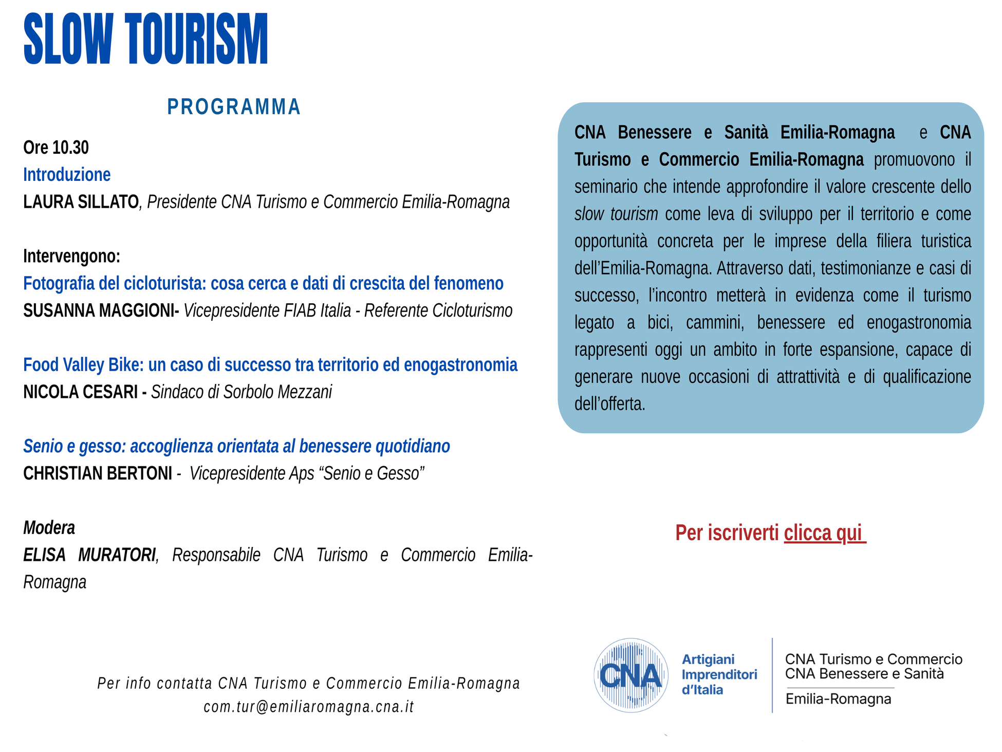 CNA Benessere e Sanità Emilia-Romagna e CNA Turismo e Commercio Emilia-Romagna promuovono il seminario che intende approfondire il valore crescente dello slow tourism come leva di sviluppo per il territorio e come opportunità concreta per le imprese della filiera turistica dell’Emilia-Romagna.